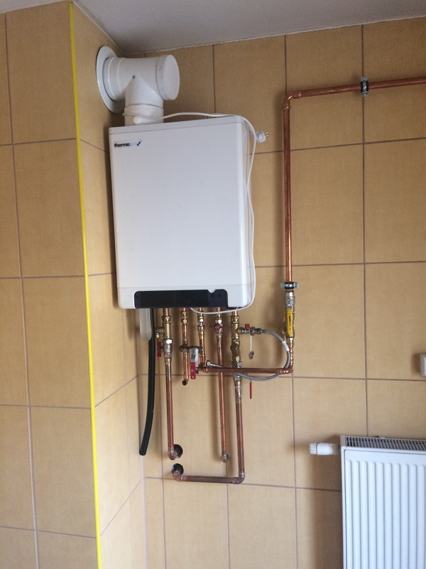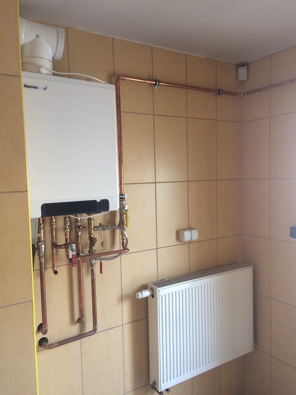 Zamontowano kocioł gazowy kondensacyjny dwufunkcyjny firmy Thermagen. Kotły firmy Thermagen charakteryzują się bardzo dużą oszczędnością, oraz prostotą konstrukcji. Ściana przed montażem i po zamontowaniu kotła.